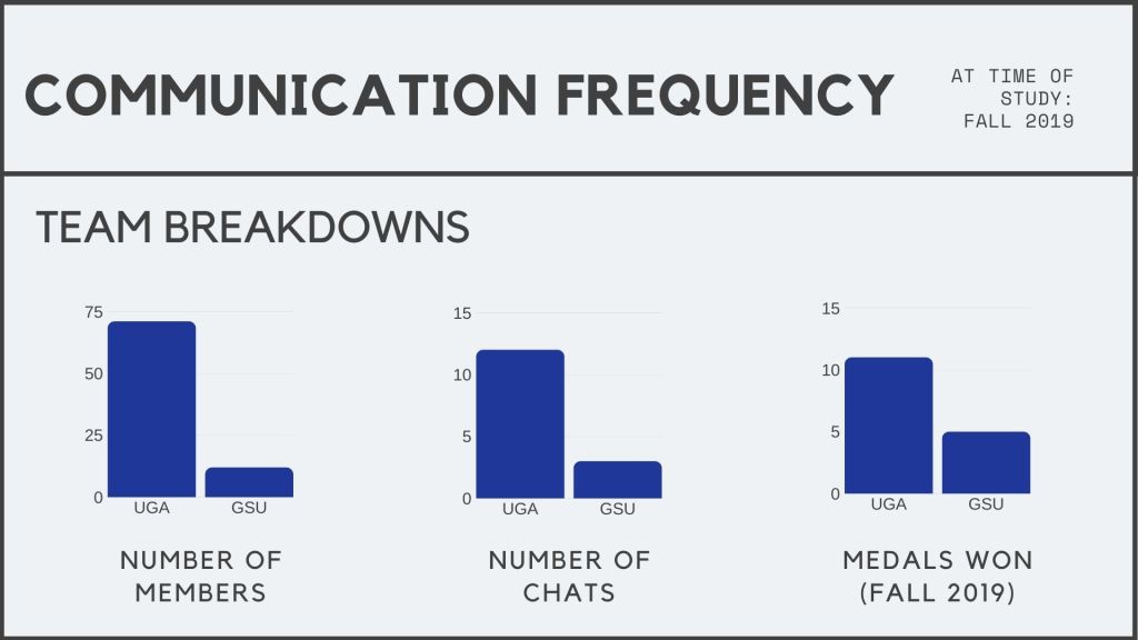 Literature in the field of sports communication and psychology aptly examines the success of types of attitudes and relationships on sports teams in a wide variety of ways. Research has tracked and formulated the best way for coaches to talk to athletes, and how often, and coaches themselves can testify to the success of changing their communication styles. However, little research has been conducted on the way athletes and coaches communicate outside of their practice times and competitions, and there are gaps in the study of communication in smaller teams or clubs. While larger teams provide a larger data sample, and might be able to better correlate communication to success, examining smaller teams and clubs provides insight into how these proposed communication techniques fail. In my research I compared two collegiate rowing clubs, the Georgia State University Rowing Club, and the University of Georgia Rowing Club. The teams are different sizes, and have vastly different team cultures, and levels of success. I myself am on the Georgia State University team, so I hoped to learn techniques I could personally apply to my own communication through this research. In my research I sought to identify how the athletes on these teams are communicating with a focus on digital methods.