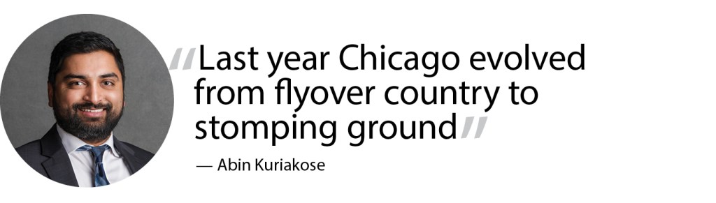 On top of the growing STEM workforce, the industry expands its reaches through a gung-ho incubator and accelerator force. Peek inside Merch Mart across the river from the fintech army of LaSalle Street and you’ll see a diorama of restaurants, design firms, food processing offices, chambers of commerce, furniture stores, and trade events alongside tech incubators.