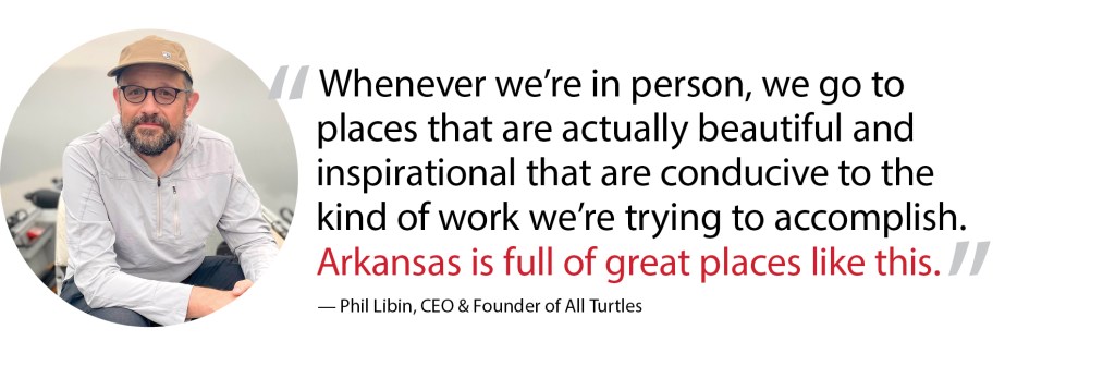 He also talks about holding multi-day summits at cabins by Beaver Lake or going to Eureka Springs. Libin doesn’t want to watch over his employees’ every move and doesn’t require a strict 40-hour-per week schedule. Employees work asynchronously on schedules that make them the most impactful, and don’t waste time with what Libin described as “sitting in a room showing each other slides” when they get together to meet. “Whenever we’re in person, we go to places that are actually beautiful and inspirational that are conducive to the kind of work we’re trying to accomplish. Arkansas is full of great places like this.”